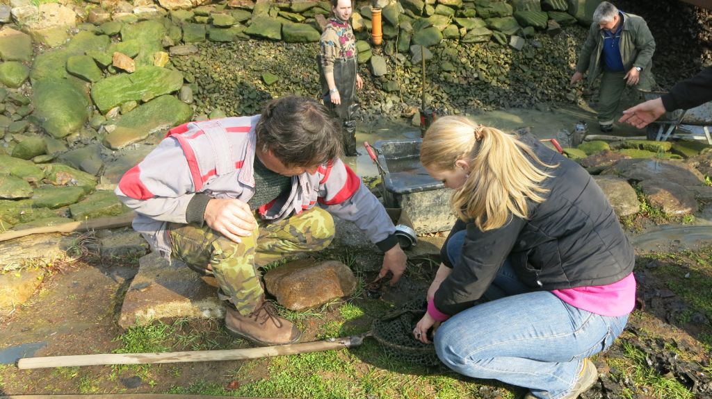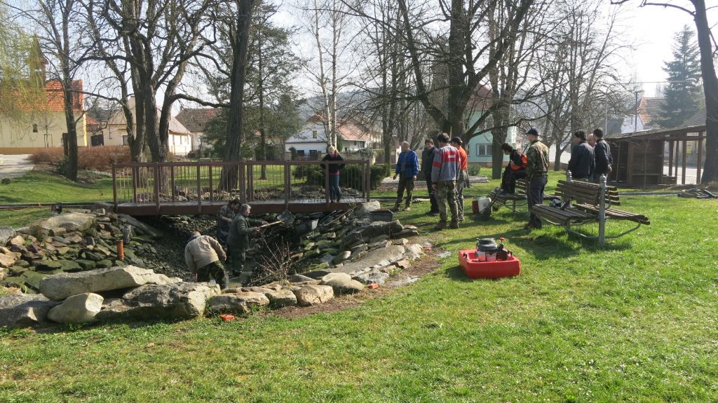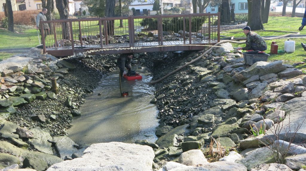 Hasiči při čistění návesního rybníčka